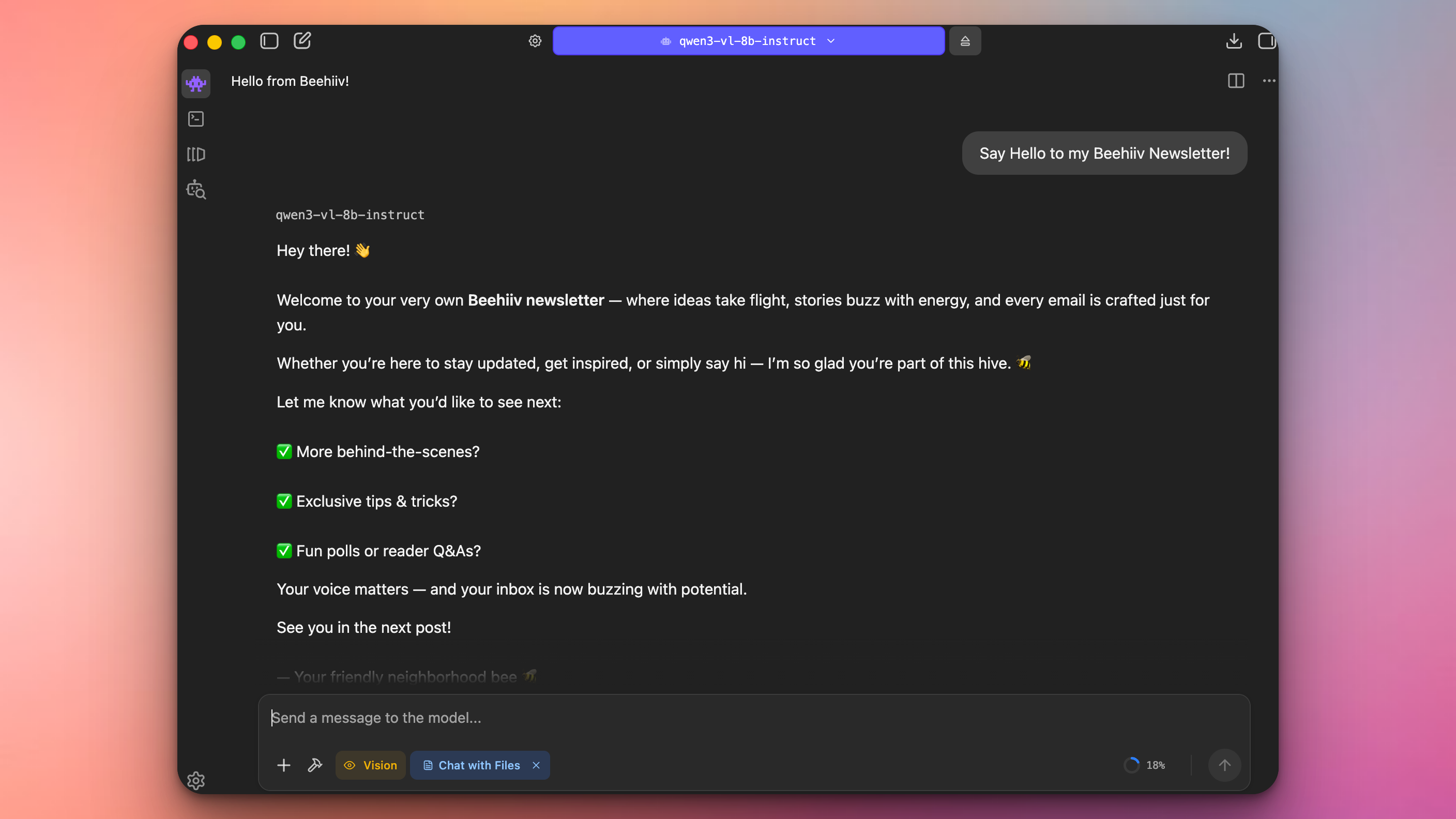 Chat to it as you would as if it was ChatGPT or Gemini, even providing it files.